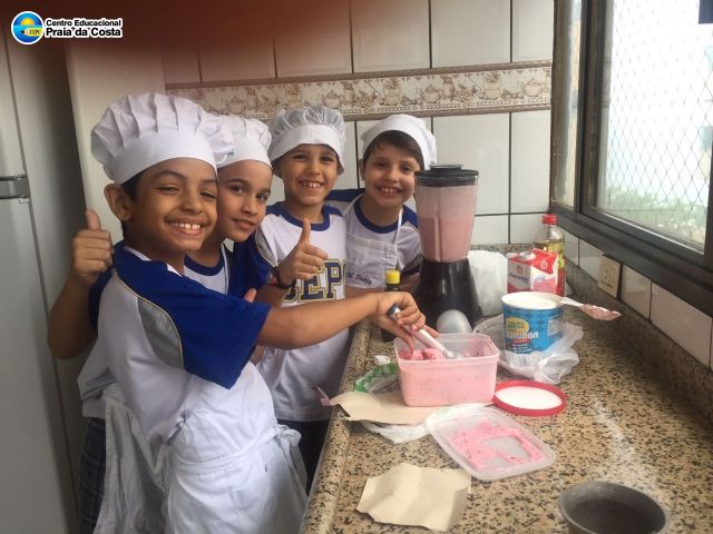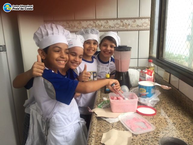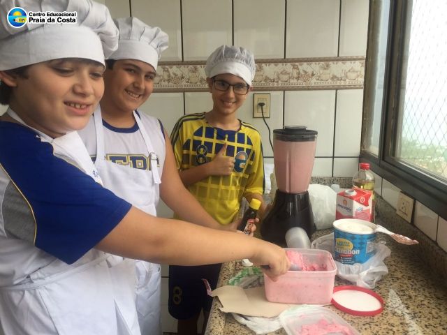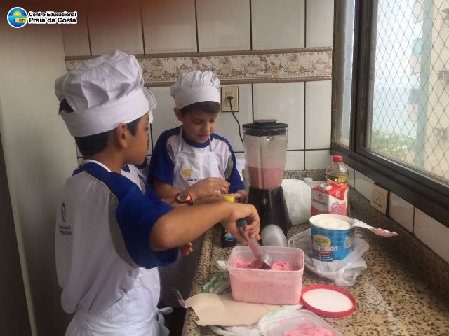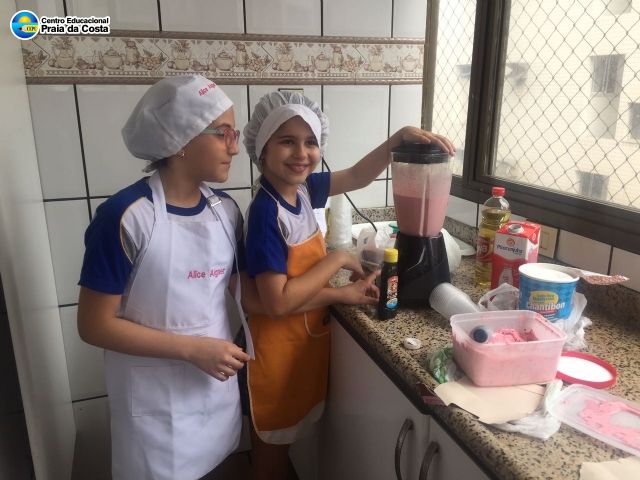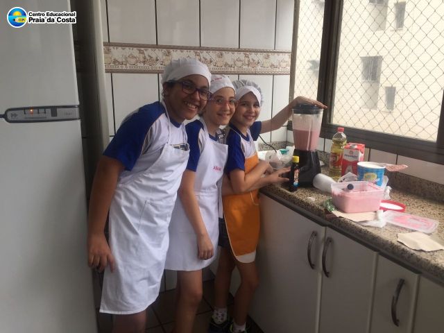 Trabalhando o conceito de litro e mililitro na aula de culinária.