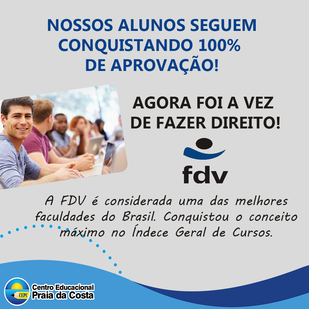 Nossos alunos seguem conquistando 100% de aprovação - FDV!Publicado em 02/07/2020 Nós, do CENTRO EDUCACIONAL PRAIA DA COSTA, apresentamos mais um resultado expressivo no vestibular da FDV. Parabéns a todos os que se empenharam para esta conquista. #cepc #faculdade #direito #ensinomedio #ensinofundamental #educaçãoinfantil ![]() |